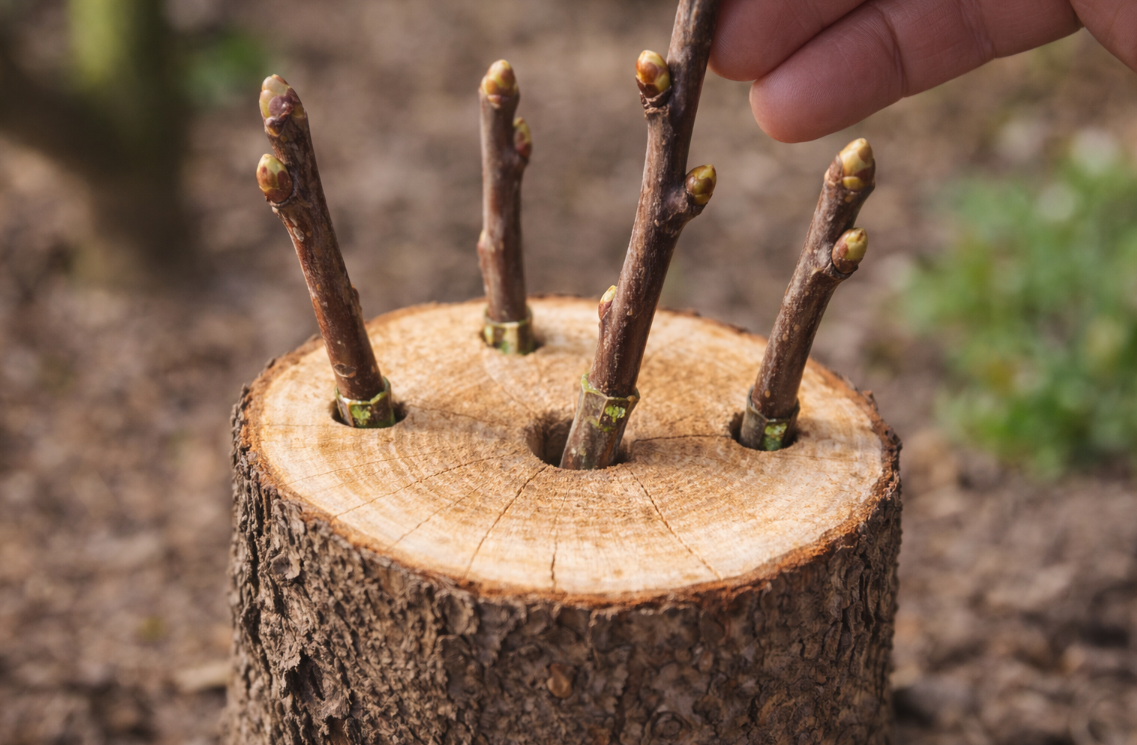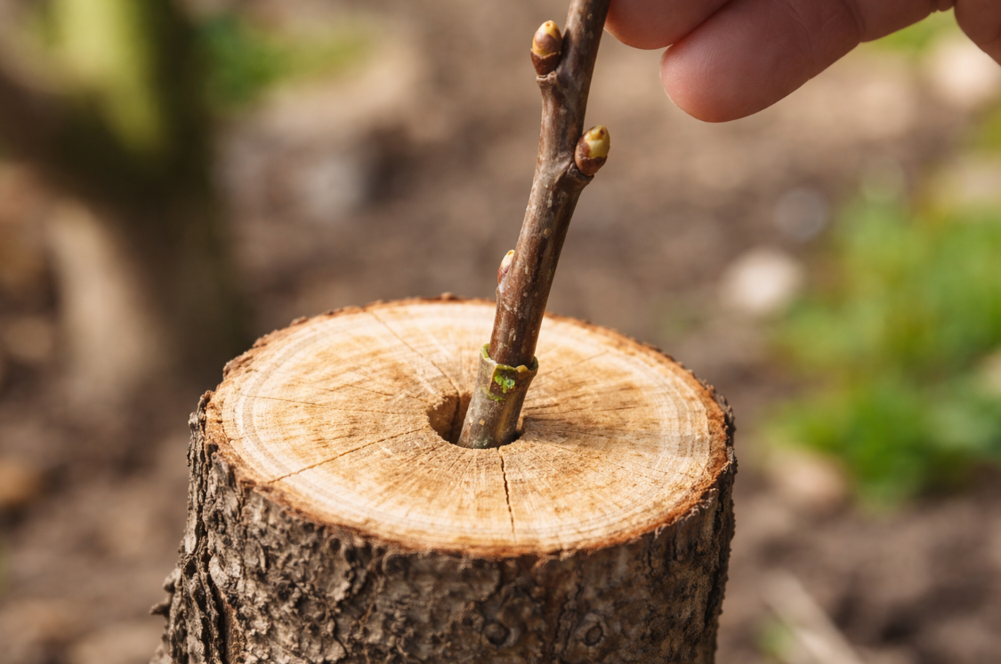Otwór musi być tylko minimalnie mniejszy niż zraz – tak, żeby wchodził z wyraźnym, lekkim oporem. Zbyt luźne dopasowanie oznaczać będzie brak kontaktu z miazgą (czyli żywą tkanką drzewa odpowiedzialną za zrośnięcie) – a to najprostsza droga do niepowodzenia.